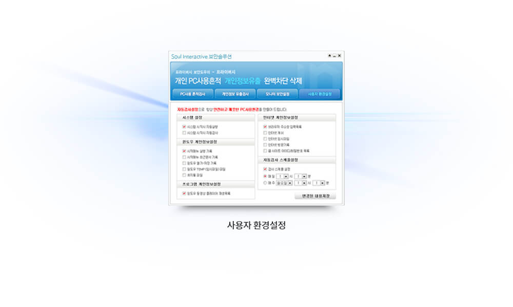 PC사용 흔적검사 / 개인정보 유출검사 / 모니터 보안설정 / 사용자 환경설정